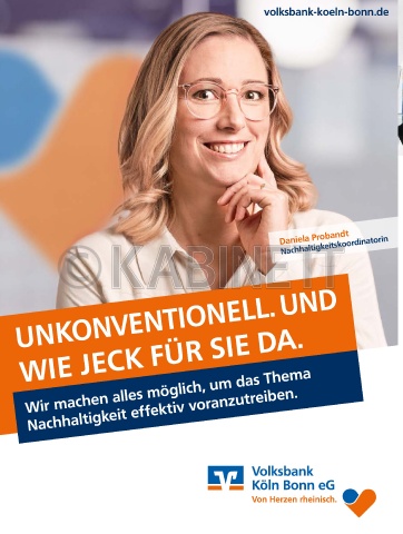 volksbank-koeln-bonn.de Daniela Probandt Nachhaltigkeitskoordinatorin UNKONVENTIONELL. UND WIE JECK FÜR SIE DA. Wir machen alles möglich, um das Thema Nachhaltigkeit effektiv voranzutreiben.